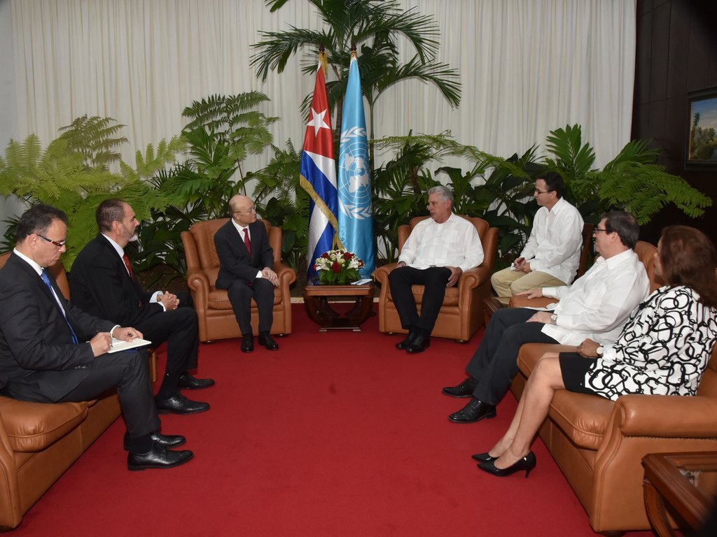 ?Los resultados concretos que Cuba ha logrado en sus proyectos conjuntos con el OIEA son encomiables?, dijo el Sr. Amano al Presidente Miguel Díaz-Canel, que estuvo acompa?ado del Ministro de Relaciones Exteriores, Bruno Rodríguez Parrilla, y de la Ministra de Ciencia, Tecnología y Medio Ambiente, Elba Rosa Pérez Montoya.