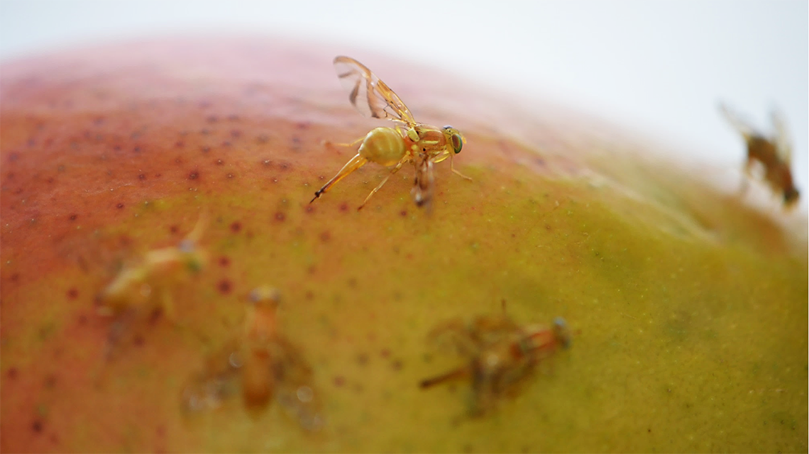 Estas moscas mexicanas de la fruta (Anastrepha ludens) se preparan para poner huevos en un mango (Fotografía: V. Dias/FAO/OIEA)