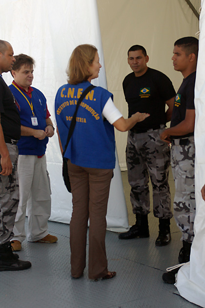 Professionals from the nuclear as well as the security fields must combine their skills to mitigate against the threat of malicious acts using nuclear and other radioactive materials. CNEN scientists and Brazilian security officers apply their varied expertise to venue entry points at the Rio Center.