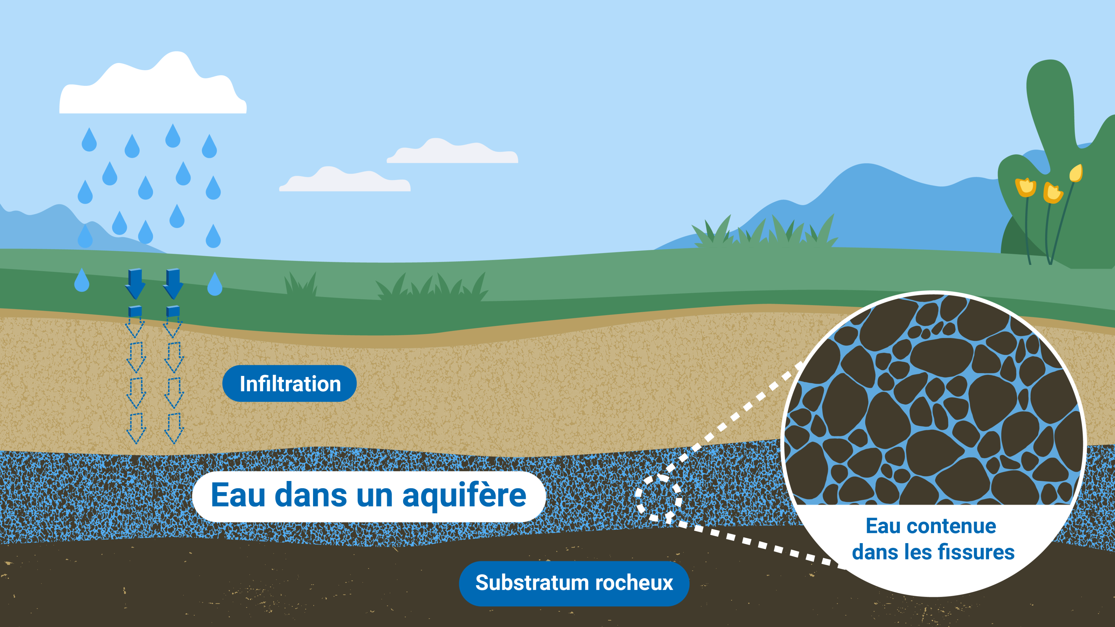 Les eaux souterraines font partie du cycle de l’eau. Lorsqu’il pleut, une partie de l’eau s’infiltre dans le sol et est drainée dans le sous-sol par gravité, jusqu’à ce qu’elle soit arrêtée par une roche compacte et imperméable, appelée ? aquiclude ?. Les aquifères sont souvent reliés à des cours d’eau et à d’autres masses d’eau de surface qui les alimentent pendant la saison sèche. Pendant la saison des pluies, ce système peut s’inverser : les eaux souterraines retournent alors dans les cours d’eau pour les réalimenter.