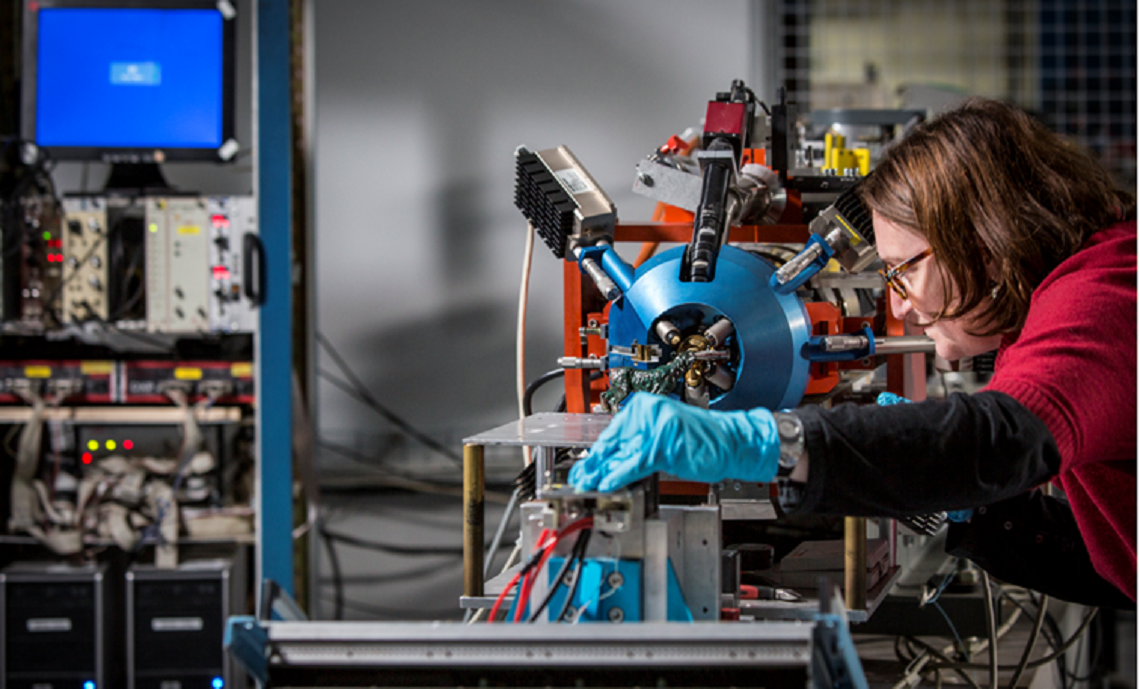 Claire Pacheco, responsable du nouvel AGLAE au Centre de recherche et de restauration des Musées de France (C2RMF), positionne un objet du patrimoine pour l’analyser à l’aide d’un accélérateur à faisceau d’ions. (Photo&nbsp;: C. Hargoues/C2RMF)