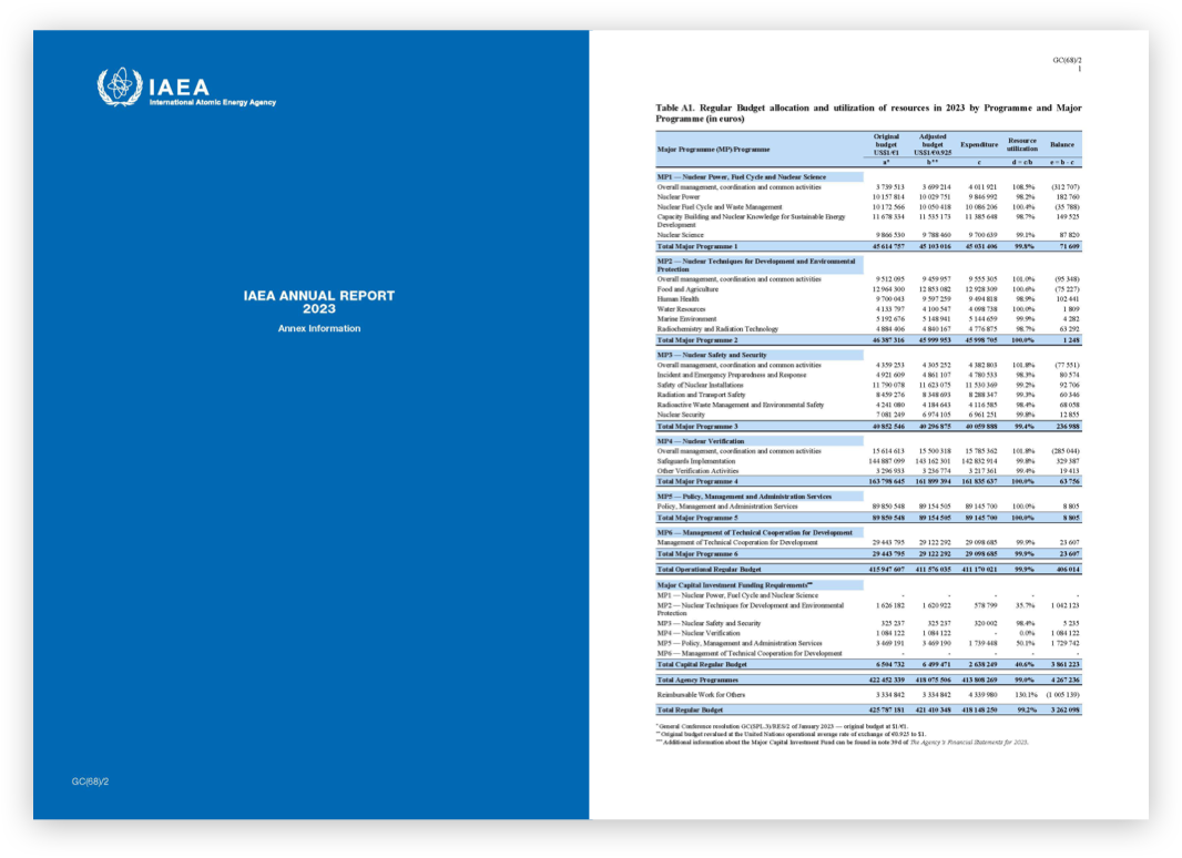 En el Informe Anual del OIEA, que suele publicarse en julio cada a?o, se resumen y destacan los avances habidos en las principales esferas de trabajo del Organismo en los últimos doce meses. En él se incluye un resumen de las principales cuestiones, actividades y logros, así como cuadros y gráficos de situación relacionados con las salvaguardias, la seguridad, y la ciencia y la tecnología.