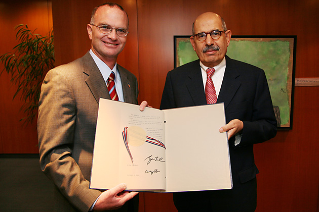 US Ambassador Gregory Schulte hands over to IAEA Director General Mohamed ElBaradei the communication of the US ratification of its Additional Protocol with the IAEA. (Photo: P. Pavlicek/IAEA)