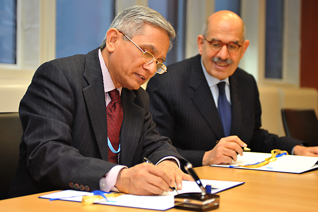 IAEA Director General Mohamed ElBaradei and Ambassador Saurabh Kumar of India sign the India Safeguards agreement, Vienna, Austria, 2 February 2009. (Photo: D. Calma/IAEA)