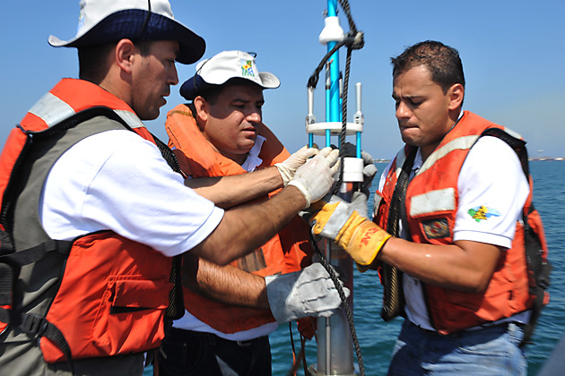 A team of scientists prepare to lower a core sediment sampling equipment just off the coast of San Pedro Sula in Honduras. The field sampling mission is part of an IAEA-supported regional project to use nuclear techniques for managing coastal pollution in the Caribbean. (Photo: D. Calma/IAEA)