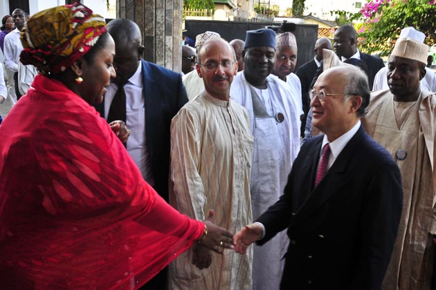 IAEA Director General Yukiya Amano is welcomed by the personal assistant to Nigeria's First Lady at the International Cancer Centre, Abuja. (Photo: Afolabi Sotunde)