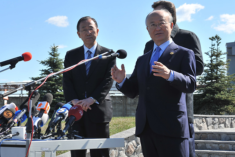 On 20 April 2011, in a special ceremony held at the Chernobyl site, IAEA Director General Yukiya Amano joined UN Secretary General Ban Ki-moon and the Ukrainian President, Viktor Yanukovych, in calling for strengthened nuclear safety worldwide. (Photo: D. Calma/IAEA)
