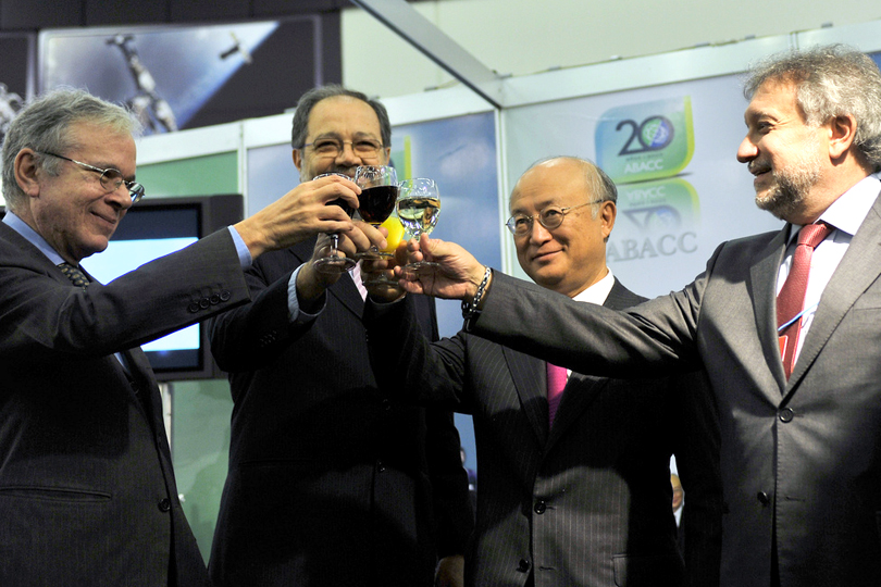 Officials from Brazil, Argentina and the IAEA raise glasses for a celebratory toast marking the 20th anniversary of the Brazilian-Argentine Agency for Accounting and Control of Nuclear Materials (ABACC). In its 20 years of existence, ABACC has made significant contributions towards the peaceful application of nuclear technologies in the Latin American region. The bi-national agreement was also essential in paving the way for the entry into force of the Treaty of Tlatelolco that established a nuclear-weapon-free-zone in Latin America and the Caribbean. (Photo: D. Calma/IAEA)