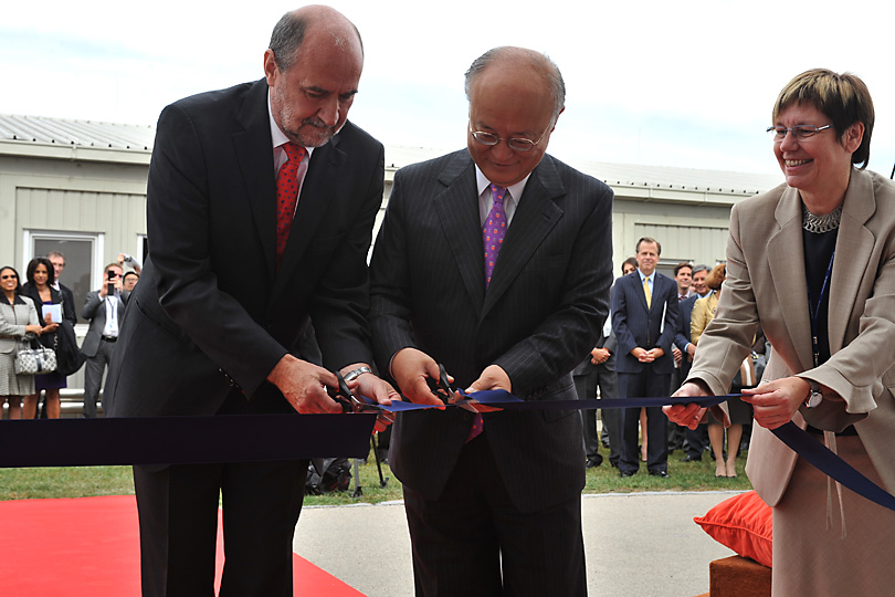 The new Safeguards Clean Laboratory Extension, which provides the Department of Safeguards with vastly improved analytical capabilities, is officially opened. IAEA Director General Yukiya Amano cuts the ribbon with the assistance of Mr. Hermann Naeckerts, Deputy Director General for the Department of Safeguards. (Photo: D. Calma/IAEA)