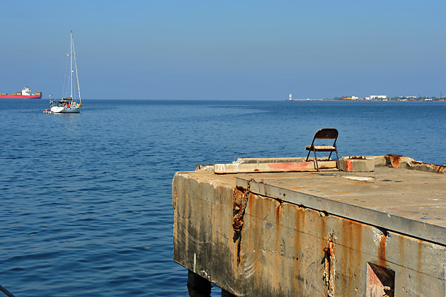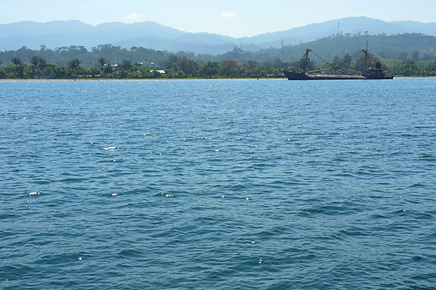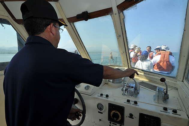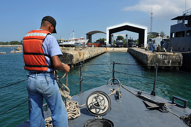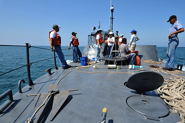The Honduran naval boat returns to port at the end of a full day of work collecting sediment samples along the costs of Puerto Cortes, Honduras.