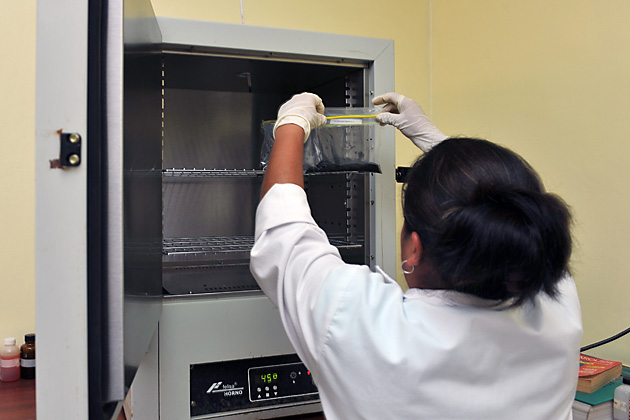 Dr. Karhen Rodriguez-Waleska, head of CESCCO Laboratory in San Pedro Sula, then weighs the sediment samples.