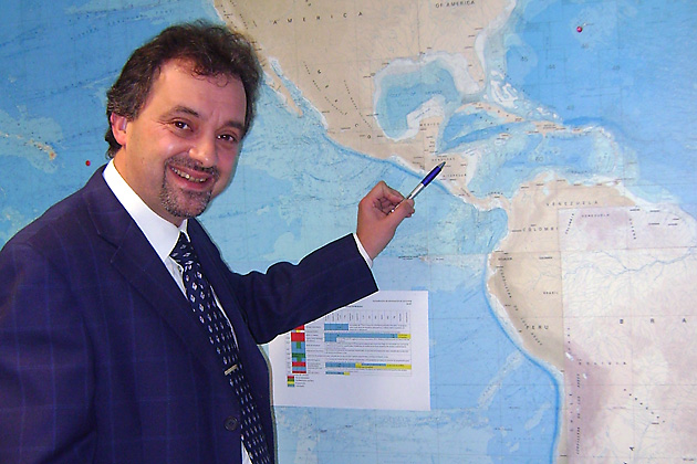 Preparing the samples for analysis is a complex process that requires varied tasks. Here, Dr. Dennys Canales-Cruz, Honduran project team leader, carefully removes a slice of the sediment sample from the vertical core.