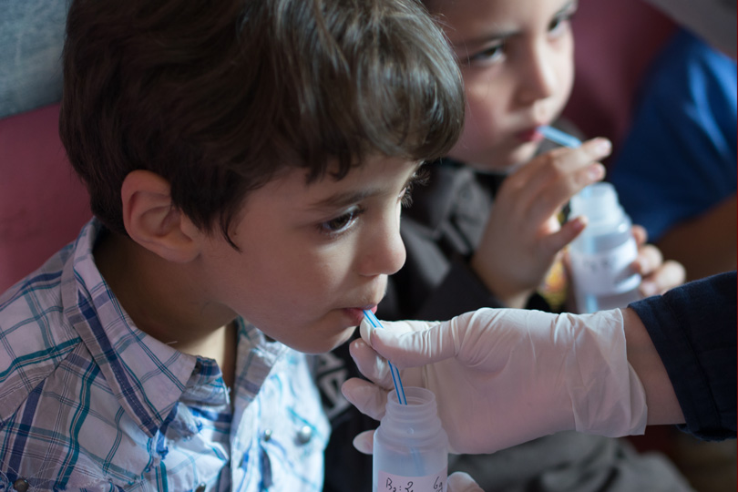 The researchers used doubly labelled water - a nuclear technique measuring non-radioactive stable isotopes of hydrogen (<sup>2</sup>H) and oxygen (<sup>18</sup>O) in urine after children have consumed specially prepared water (a mixture of <sup>2</sup>H<sub>2</sub>O and H<sub>2</sub><sup>18</sup>O). <br /><br />(Photo: S. Henriques/IAEA)