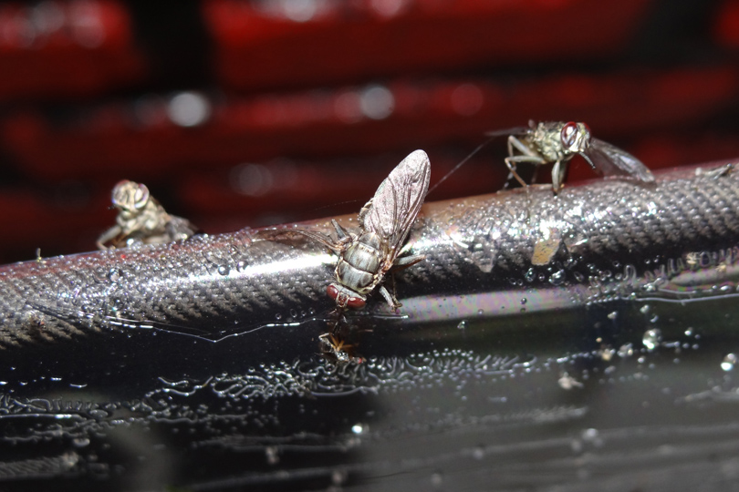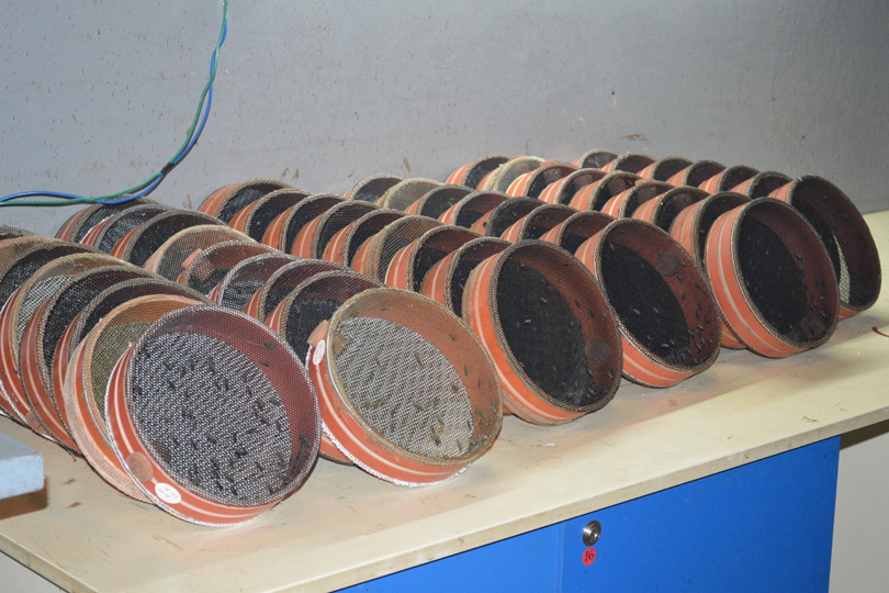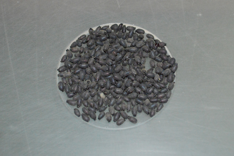 After all the females have emerged, the remaining male pupae are covered with a mixture of sand and fluorescent dye. This means they are marked as they leave their puparia and can be identified later as sterile males when trapped in the wild.