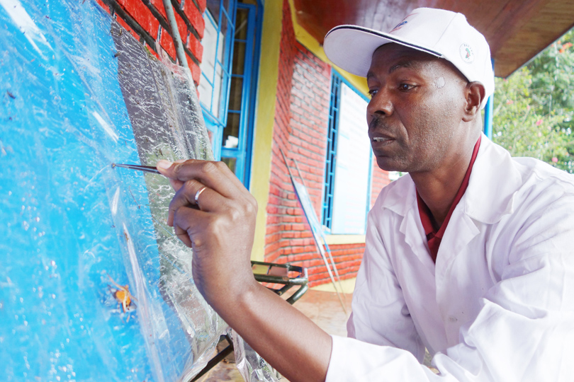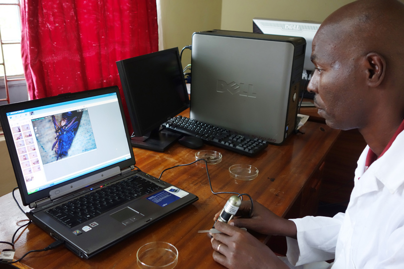 The team uses an ultra violet light to identify the fluorescent dye put on the sterile males at the Kality facility in Addis Ababa to distinguish captured sterile flies from wild flies.