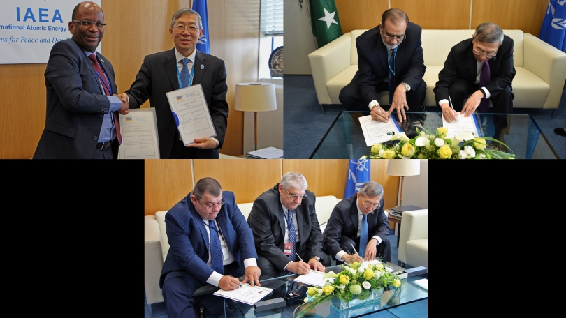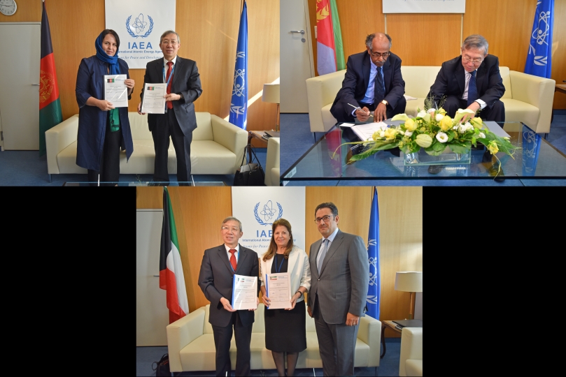 Over the course of the General Conference, nine Country Programme Frameworks (CPFs) were signed between the Department of Technical Cooperation and Member States. A CPF is the frame of reference for medium-term planning of technical cooperation between a Member State and the IAEA. It identifies the priority areas where nuclear technology can be used to address priority national development goals. Clockwise from top left: CPF signing ceremonies with Afghanistan, Eritrea and Kuwait.