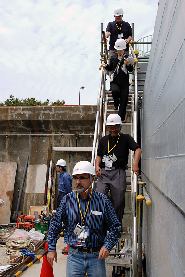 26 May 2011. Members of the IAEA fact-finding team to Japan descend a ladder to the seawater intake pump area of the Tokai Daini nuclear power plant, where workers recently built a wall (right) at a much taller height than the previous water barriers.