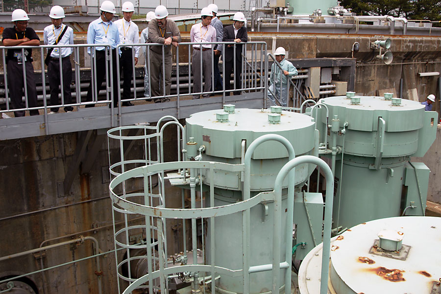 IAEA fact-finding team members tour TEPCO's Fukushima Daiichi nuclear power plant on 27 May 2011. Here they visited the dry cask storage facility, still flooded with seawater following the 11 March earthquake and tsunami. Note the seaweed clinging to pipes and railings above.