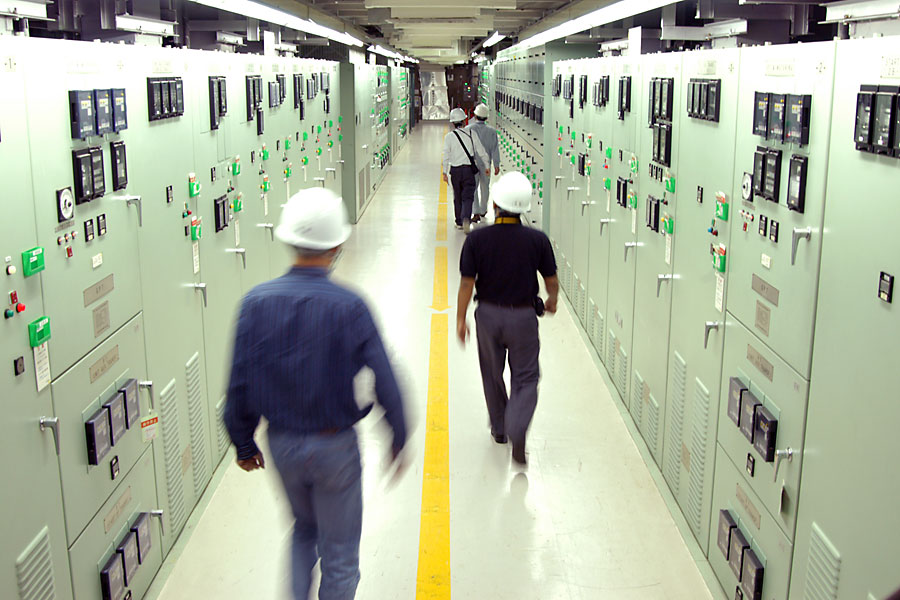 26 May 2011. IAEA fact-finding team members walk along a corridor flanked by electrical equipment at the Tokai Daini nuclear power plant.