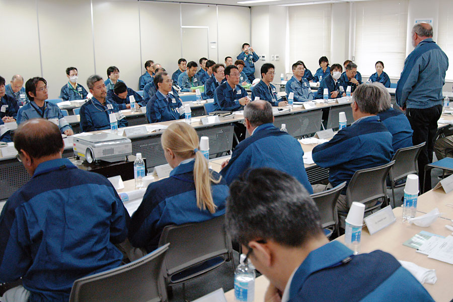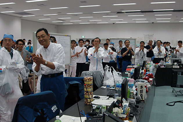 Japanese workers at the technical support centre of TEPCO's Fukushima Daiichi nuclear power plant welcome remarks by IAEA fact-finding team leader Mike Weightman on 27 May 2011. In shirtsleeves at left is plant manager Masao Yoshida.
