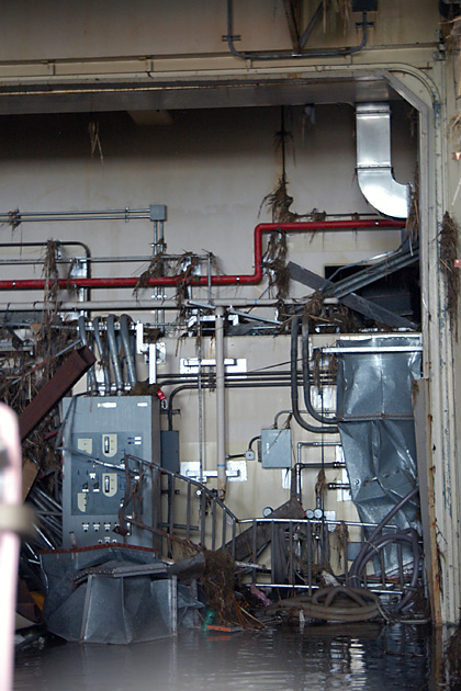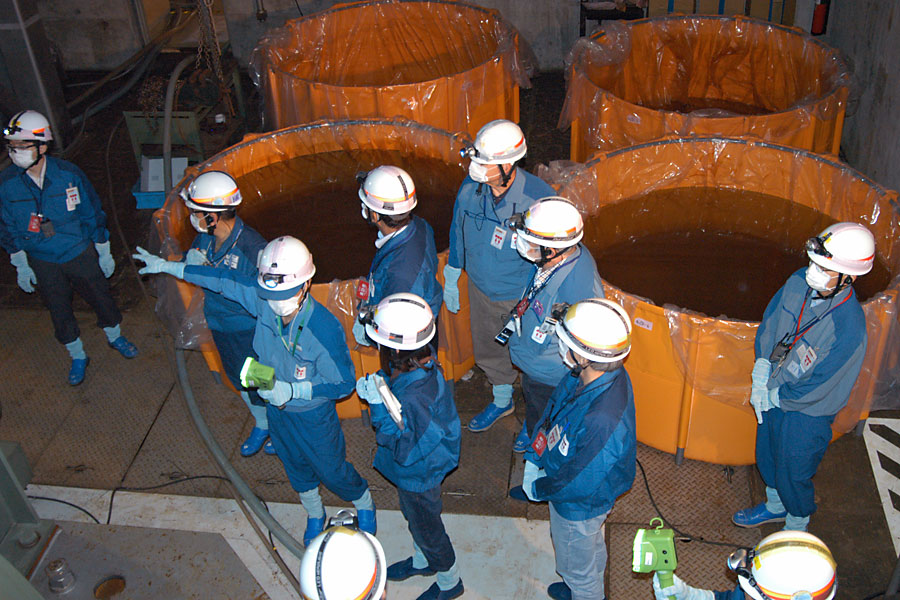 26 May 2011. Members of the IAEA fact-finding team in Japan examine the diesel generator room at Unit 1 of TEPCO's Fukushima Daini nuclear power plant. The room was flooded by seawater during the 11 March tsunami, and Japanese workers have transferred the water into the containers shown.