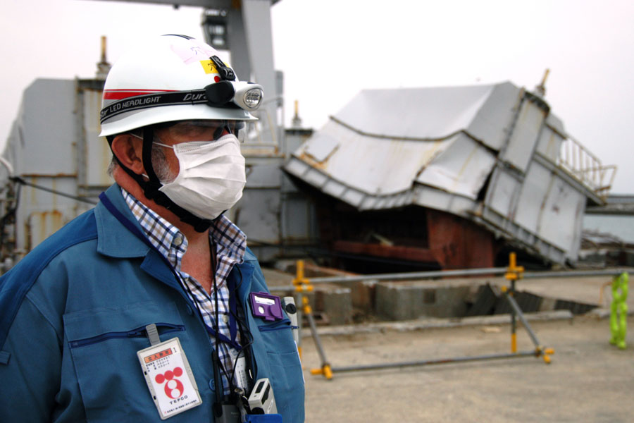 26 May 2011. A member of the IAEA fact-finding team examines an earthquake- and tsunami-damaged structure near the seawater intake area at the Tokai nuclear power plant.