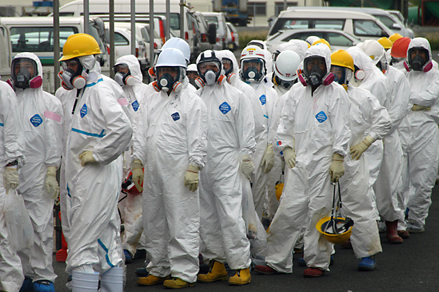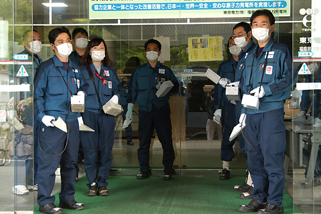 Japanese workers at TEPCO's Fukushima Daiichi nuclear power plant prepare to enter the site's technical support centre on 27 May 2011. To keep the centre uncontaminated by outside radiation and debris, rigorous precautions are followed for all who enter or leave the facility.