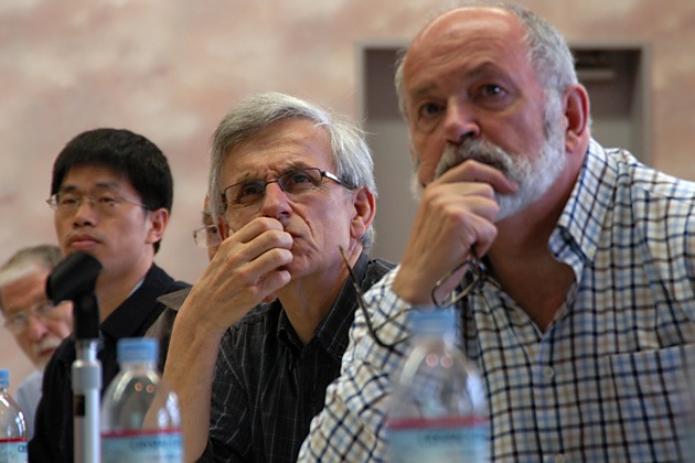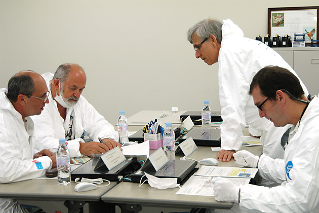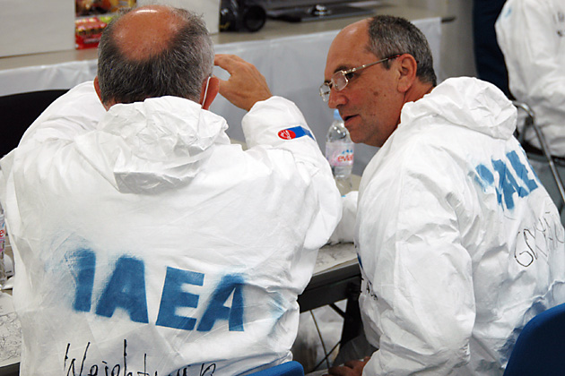 IAEA fact-finding team leader Mike Weightman (right) and deputy team leader Philippe Jamet (centre) observe a briefing at the Tokai nuclear power plant on 26 May 2011.