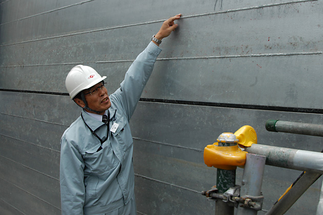 A Japanese official shows how high the tsunami rose at one part of Japan's Tokai nuclear power plant following a major earthquake on 11 March 2011. IAEA fact-finding team members toured the plant on 26 May 2011.