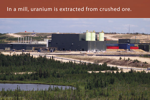 <p>URANIUM MILLING</p><p>Milling is generally carried out close to a uranium mine. Uranium ore is crushed and chemically treated to separate the uranium.</p><p>The result is ‘yellow cake’, a yellow powder of uranium oxide. In the yellow cake the uranium concentration has been raised to more than 80%. The uranium oxide concentrate is shipped from the mill to a conversion facility.</p> © WNA