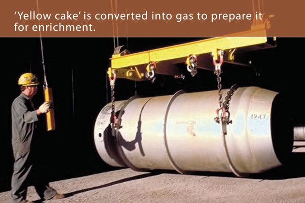 <p>CONVERSION</p><p>Natural uranium consists primarily of two isotopes, 99.3% is U-238 and 0.7% is U-235. The fission process, i.e. the process by which energy in the form of heat is released in a nuclear reactor, mainly takes place in U-235. Most nuclear power plants today therefore require fuel with U-235 enriched to 3-5%.</p><p>To increase the concentration of U-235, yellow cake is first converted to a gaseous form, uranium hexafluoride gas (UF6) at a conversion facility.</p><p>UF6 gas is filled into large cylinders where it solidifies. These strong metal containers are shipped to an enrichment plant.</p> © WNA