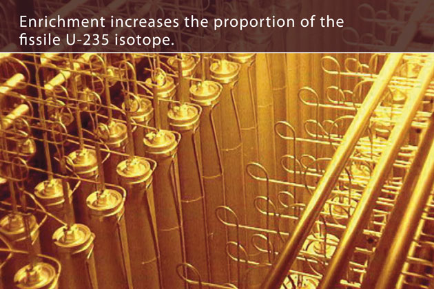 <p>ENRICHMENT</p><p>The uranium is enriched in U-235 either by pumping UF6 gas through porous membranes that allow U-235 to pass through more easily than heavier isotopes, such as U-238, or by introducing the gas in fast-spinning cylinders (‘centrifuges’), where heavier isotopes are pushed out to the cylinder walls.</p><p>The uranium remaining after enrichment has a lower content of U-235 and is known as depleted uranium.</p> © WNA
