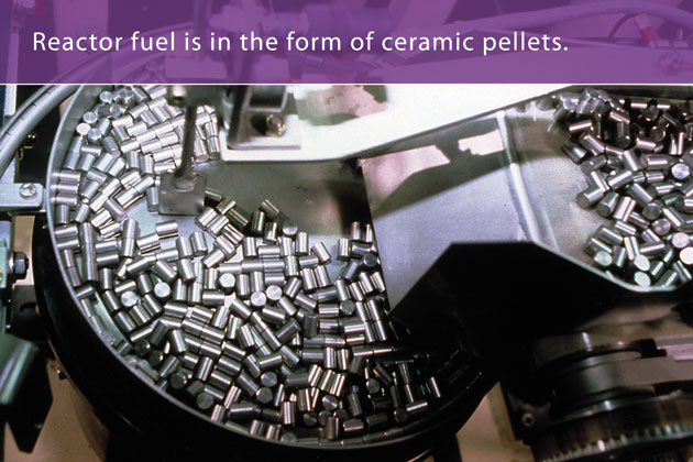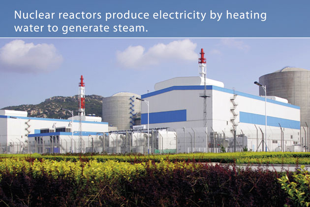 <p>ELECTRICITY GENERATION</p><p>Inside a nuclear reactor, controlled fission occurs. Fission means that the U-235 atoms are split. The splitting releases heat energy that is used to boil water and produce high pressure steam. The steam turns a turbine connected to a generator, which generates electricity.</p><p>Some of the U-238 in the fuel is converted into plutonium (e.g. Pu-239) in the reactor core. Plutonium is also fissile and can be split generating heat. About one third of the energy in a typical nuclear reactor comes from the plutonium.</p><p>The fuel stays in the reactor for 3-6 years and about once a year, 20 to 30% of the fuel is unloaded and replaced by fresh fuel.</p> © Xuxin Zou / IAEA