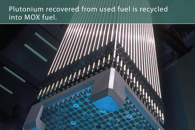 <p>MOX FUEL FABRICATION</p><p>The plutonium recovered through reprocessing could be used in the manufacture of mixed oxide (MOX) nuclear fuel. MOX fuel is a mixture of about 5% plutonium oxide in natural uranium oxide.</p><p>A single recycle of Pu in the form of MOX fuel increases the energy derived from the original uranium by some 12% (WNA).</p> © MELOX / France