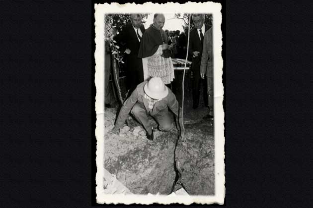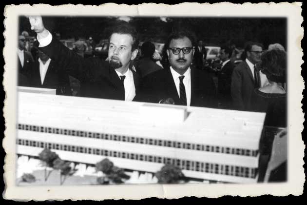 Professor Paolo Budinich, ICTP Deputy Director, and Professor Abdus Salam, the co-founders of the ICTP, lay the cornerstone for the ICTP's headquarters, Trieste, 18 June 1964.