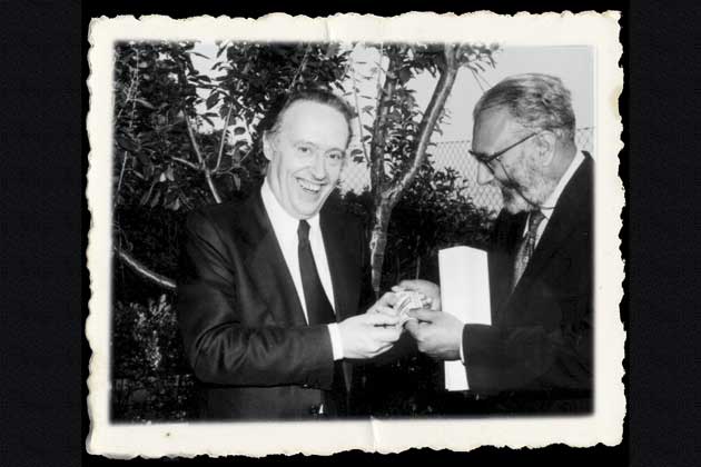 Abdus Salam jokingly pays a symbolic rent of one U.S. dollar to the representative of the Italian Government and Rector of Trieste University, Professor Giampaolo de Ferra, Trieste, 1977.