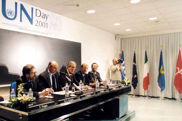 ICTP Director Miguel Angel Virasoro holds the UN Day for the first time at ICTP. The Mayor of Trieste is second from left, ICTP, October 2001.