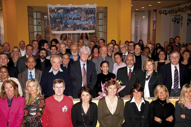 Farewell party for ICTP Director Katepalli R. Sreenivasan. The new Director, Professor Fernando Quevedo, is on the left, behind Mr. Natesan Ramamoorthy of the IAEA, ICTP, November 2009.