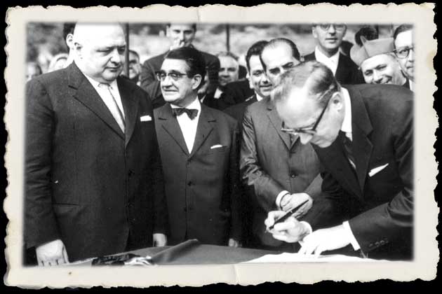 IAEA Director General Sigvard Eklund signs the parchment to be sealed in the ICTP building's cornerstone. Trieste's Mayor Mario Franzil (left) looks on, Trieste, 18 June 1964.