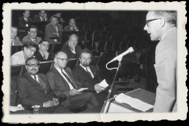 The Symposium on Elementary Particles Interactions marks the first time Abdus Salam meets Trieste University's physicists, Trieste, Italy, June 1960.