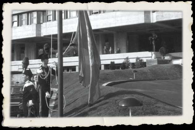 The Carabinieri in full dress uniforms hoist the UN flag at the just-opened ICTP Building, ICTP, June 1968.