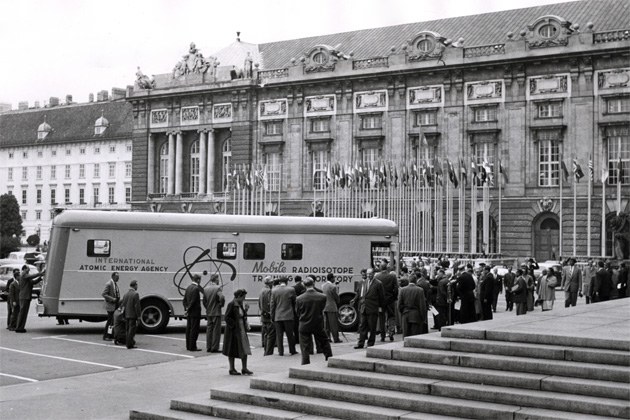 Mr. John A. McCone, Chairman of the US Atomic Energy Commission and chief delegate to the IAEA Conference, presented the Mobile Isotope Laboratory to the International Atomic Energy Agency in a ceremony at the Hofburg Palace in Vienna on September 24, 1958. (Photo Credit: IAEA)