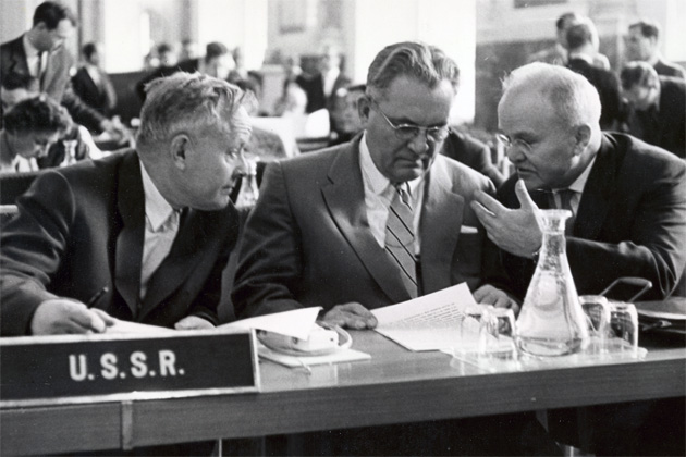 Russian delegation to the 4th regular session of the IAEA General Conference. From left to right Prof. V.S. Emelyanov, Chairman of the Council of Ministers, K. V. Novikov, Governor from the Soviet Union on the IAEA Board of Governors, V. M. Molotov, Ambassador, Resident Representative to the Agency. 20 September 1960 (Photo Credit: IAEA)