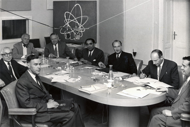 Seven distinguished scientists of the Scientific Advisory Committee of the IAEA met to advise the Agency on scientific matters concerning its activities: Dr. R. Spence, Dr. Isidor Rabi, Dr. B. Groess, Prof. Emelyanov, Dr. Homi Bhaba, Dr. B. Goldschmidt, Dr. H. Seligman, Dr. W. Lewis and IAEA Director General Sterling Cole. 4 June 1959 (Photo Credit: IAEA)