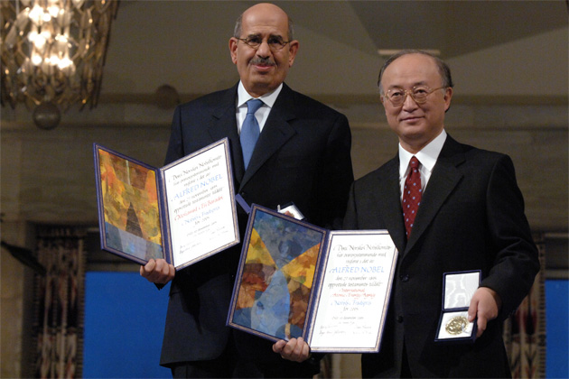 IAEA Director General Mohamed ElBaradei and Ambassador Yukiya Amano, Chairman of the Board of Governors, at the Nobel Prize award ceremony at the Oslo City Hall. Oslo, Norway, 10 December 2005 (Photo Credit: Dean Calma)