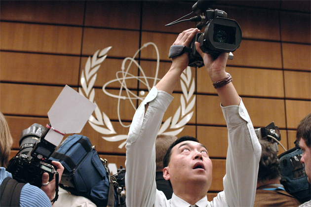 A cameraman jostles for best position to capture events at a photo oppurtunity inside the IAEA Board room. Vienna, Austria, 2 February 2006 (Photo Credit: Dean Calma)