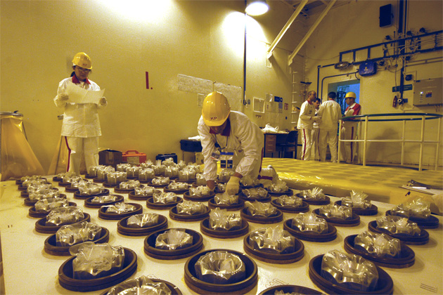 IAEA inspector scanning fuel assemblies during a comprehensive training excercise at Mochovce Nuclear Power plant. Slovakia, January 2005 (Photo Credit: Dean Calma)