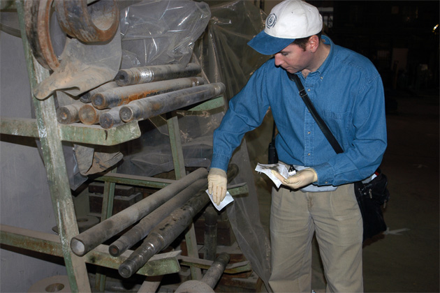 An IAEA inspector taking smear samples at a machine factory during an IAEA inspection in Iraq. Iraq, December 2002 (Photo Credit: Petr Pavlicek)