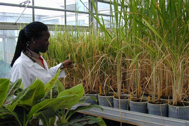 An IAEA technician checks the growth of rice at the Seibersdorf Laboratories. Seibersdorf, Austria, August 2000 (Photo Credit: Dean Calma)