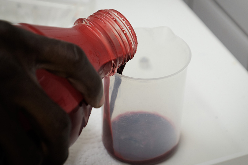 Pig's blood, collected from local abattoirs, is used to feed the female insects. It is heated first to body temperature. Around two litres of blood are used each day.